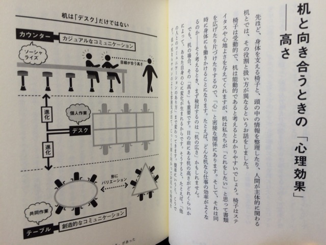 人と顔を突き合わせて打ち合わせや会議をする際にも、机の高さ・配置などを工夫し、進むべき方向へ向かわせるお膳立てができるというのは、かなり興味深かったです。また、自分のサラリーマン時代を思い出してみても、紙の書類が山積みになっていましたが、これを避けることがもっとも重要なことだったんだと改めて気付かされますね。