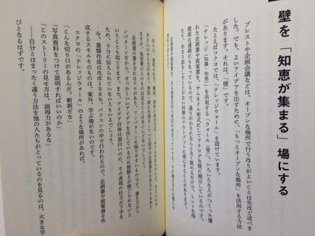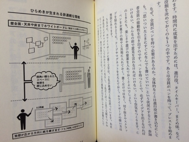 これを目標に、さまざまな改善策が提案された一冊。自分の坐る席を決めない「フリーアドレス制」や、会議や集まりの種類によって机の高さや配置を変えたり、壁面全体を大きなホワイトボードにしてアイディアを出しやすくしたり。いろんなタイプの改善策があるものですね。