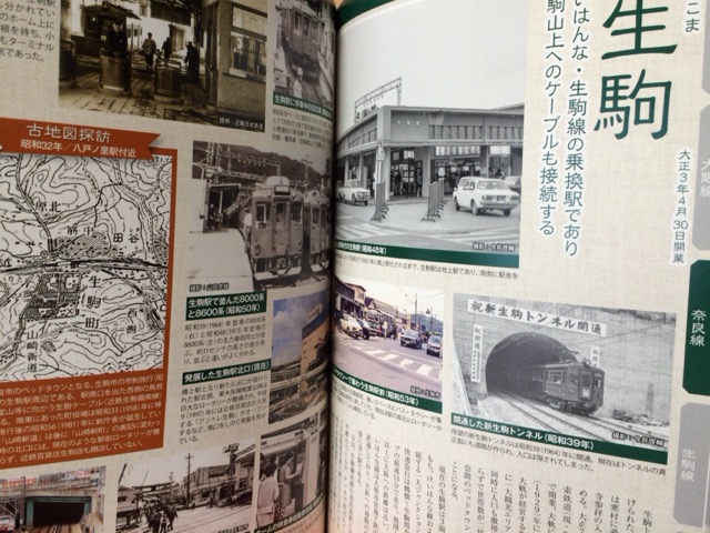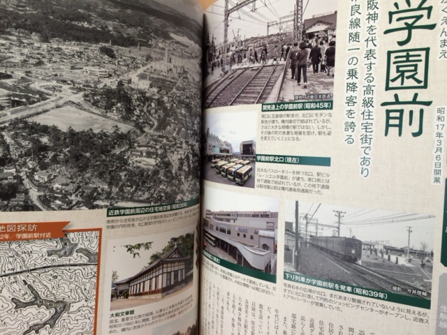 本書で紹介されるのは、近鉄奈良線(と大阪線・難波線の一部)・生駒線・けいはんな線の各駅です。古い白黒写真も豊富に掲載されていて、今では賑やかな学園前駅など、高い建物がまったく見当たらない時代の画像などもあります。