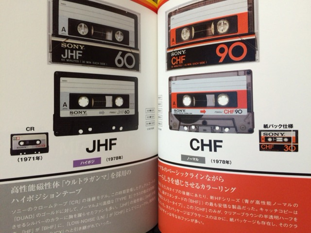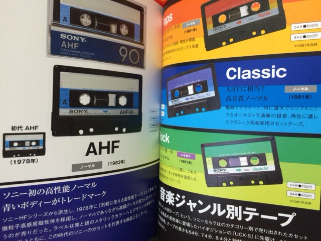 圧巻なのは、やはりカセットテープの写真と、その機能が紹介してあるページです。SONYでいうと、1972年発売の「C60」から始まり、その後のCHF、JHF、AHF、BHF、DUAD、METALLIC、HFなどへと続き、音楽ジャンル別(Pops、Classic、Rock)なども網羅されています。少ないお小遣いの中からどれを買おうか……と、店頭で散々迷った記憶が蘇りますね(笑)