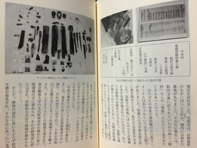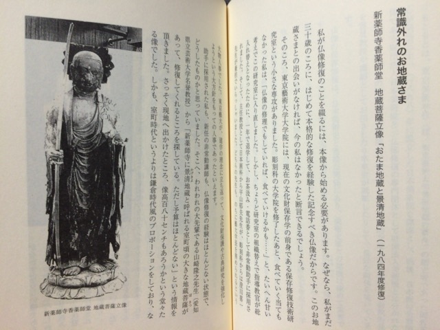 第四章の「壊れた仏像は語る」では、薮内先生の研究室で修復した中から、印象的だった像を挙げられていますが、その筆頭に出てくるのが新薬師寺香薬師堂・地蔵菩薩立像(おたま地蔵と景清地蔵)でした。普通のお地蔵さまかと思って調査を進めると、男性のシンボルまで作られた裸の像に、衣状の像をかぶせた二重構造だったという、とても珍しいものです。発見の様子がリアルに書かれています。