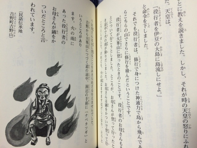 しかし、やはり特徴的なのは、吉野の歴史に根付いたものです。神武天皇を道案内したとされる井氷鹿(いびか)が現れた「井光の井戸」、高見山にある蘇我入鹿の首塚の話(飛鳥にもありますね)、役行者や金峯山寺の「蛙跳び」行事のもととなった姿を蛙に変えられた男の話、義経と弁慶、後醍醐天皇、さらに天誅組まで、かなり幅広く紹介されています。