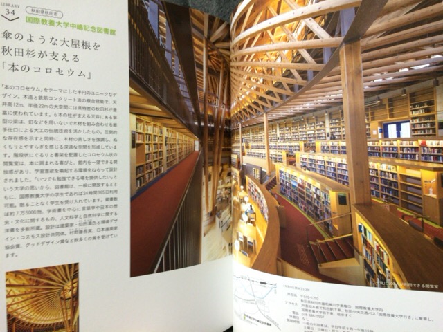 なかでももっとも美しいと感じるのが、表紙にも登場する「国際教養大学中嶋記念図書館」(秋田県秋田市)です。段差をつけて半円形のスペースがせり上がっていく、野球場の観客席のような造りで、和傘をイメージさせる半円形の秋田杉の大屋根が覆っています。これがとにかく美しい!東北旅行へ行ったらぜひ立ち寄ってみたいと思うくらいです。