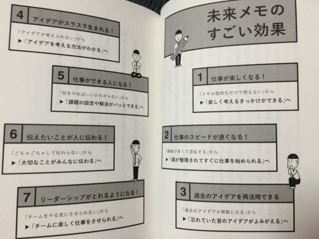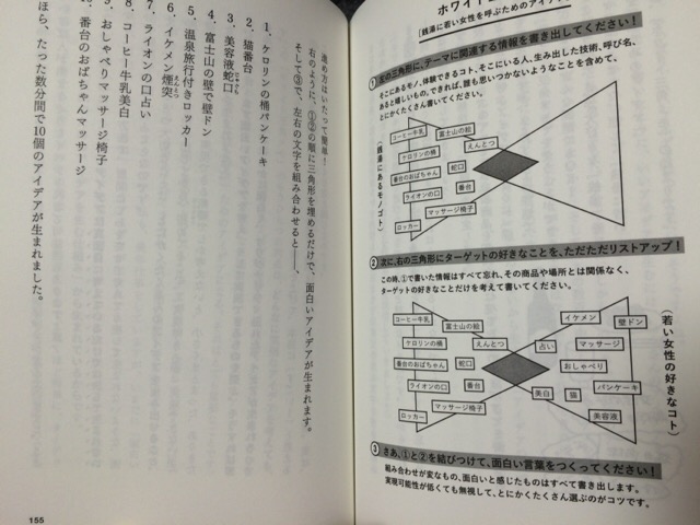 発想法としてのメモ術もあり、「ブラック三角メモ」(不平不満から隠れニーズ探る)、「ホワイト三角メモ」(テーマとターゲットの好きなものをくっつける発想法)、「つなぎメモ」(思い浮かんだアイディアアをつないで書き出していく)など、取り入れてみたいものもいくつも見つかりました。