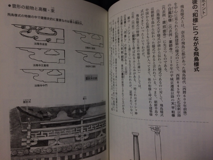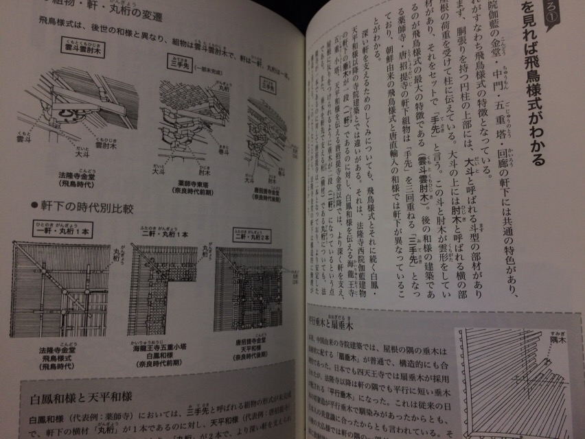 例えば法隆寺であれば、後の「和様」につながる飛鳥様式が見られ、それを理解するためのポイントは「軒下」を見ることだとか。単に「こういう特徴です」だけではなく、飛鳥様式の法隆寺金堂、白鳳和様の海龍王寺五重小塔、天平和様の唐招提寺金堂というように、比較のイラストがあるのが特徴で、これがとても分かりやすいんですよね。