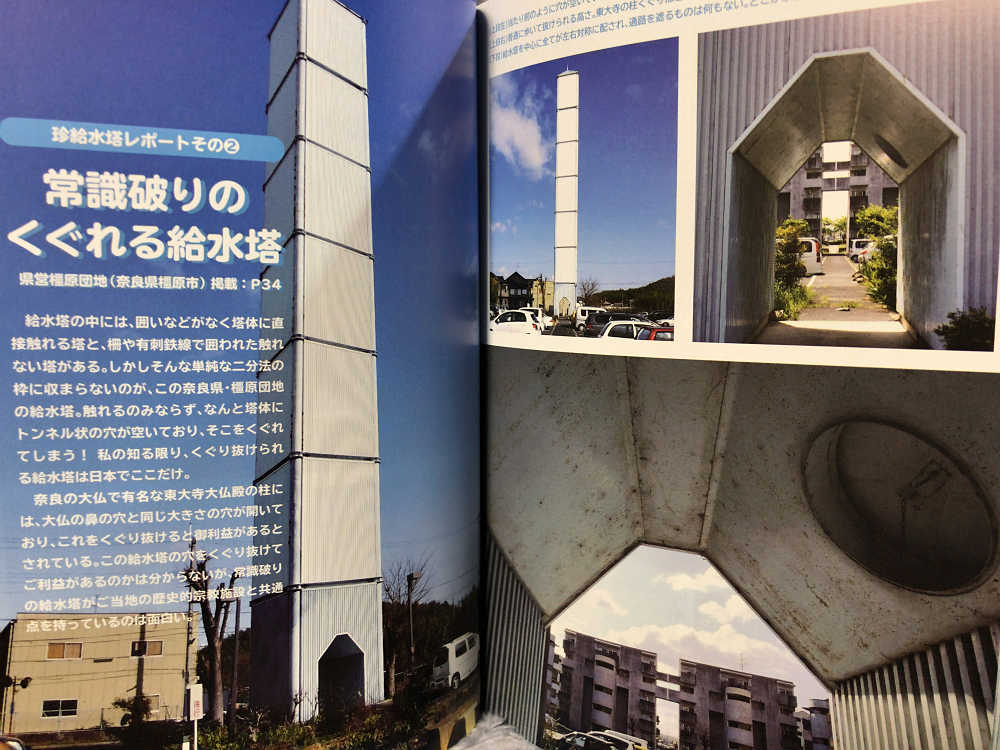 また、橿原市の県営橿原団地にある給水塔は、「常識破りのくぐれる給水塔」と題して、見開き2ページで紹介されています。ただ単にくぐれるだけで、誰にも何のメリットもないんですが、なぜこんな形状になったんでしょうか?