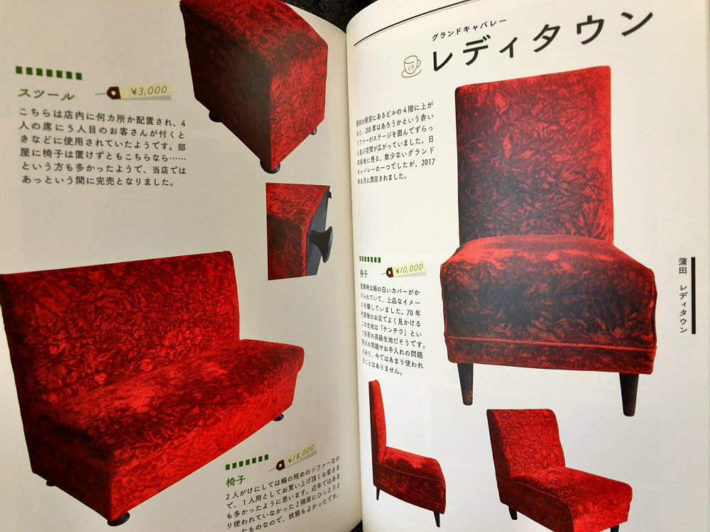登場するのは、凝った装飾のある純喫茶の椅子だったり、四角くてアールの美しい脚がついた喫茶店テーブルだったり、またはグランドキャバレーの赤い別珍のソファーだったり、老舗和菓子店の木の椅子だったり。どれも美しく、その佇まいから背景のドラマが感じられるようです。