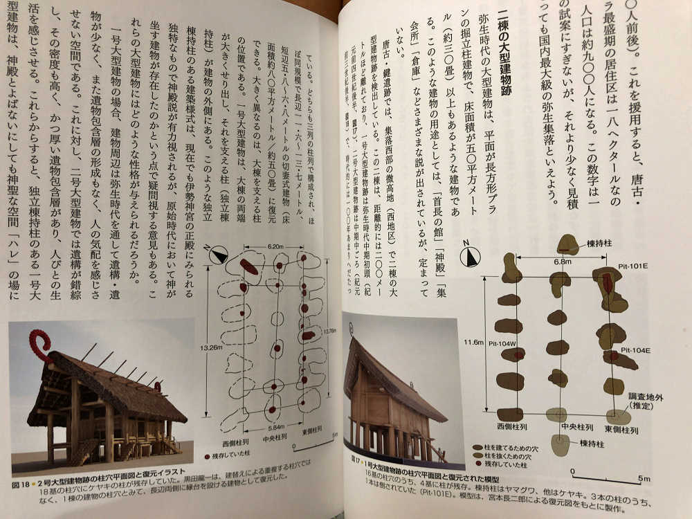 ●弥生時代の2棟の大型建物跡が見つかっている。1棟は大棟を支える柱が建物の外側にある、伊勢神宮・正殿のような形。神殿説が有力視されているが、原始時代において神が坐す建物が存在したのかという点で疑問視する意見も。