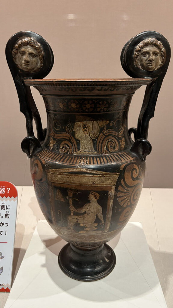 ▲こちらは「ギリシア陶器 赤像式渦形クラテル」(イタリア、紀元前4世紀頃)。イタリアのお墓の中から見つかった、ワインと水を混ぜるための器だとか。両耳の女性の顔が怖い……。呪物的ですらあります。