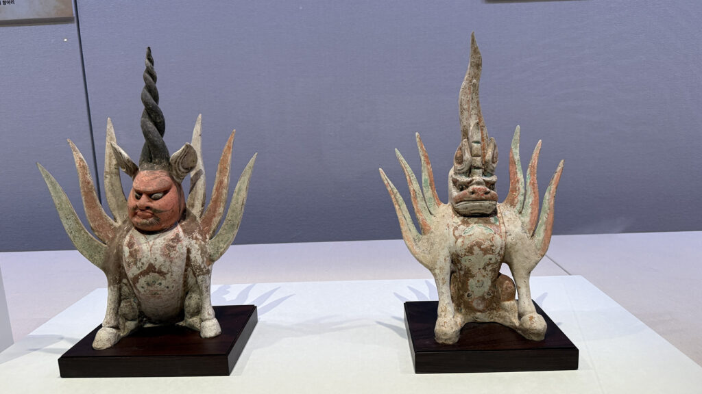 中国のお墓を守護した「加彩鎮墓獣」(中国、唐時代 8世紀)。遣唐使が派遣されるなどして奈良の都ともゆかりの深かった唐の国ですが、この造形は呪術的で古代っぽさがぷんぷんと感じられます。いいですね!