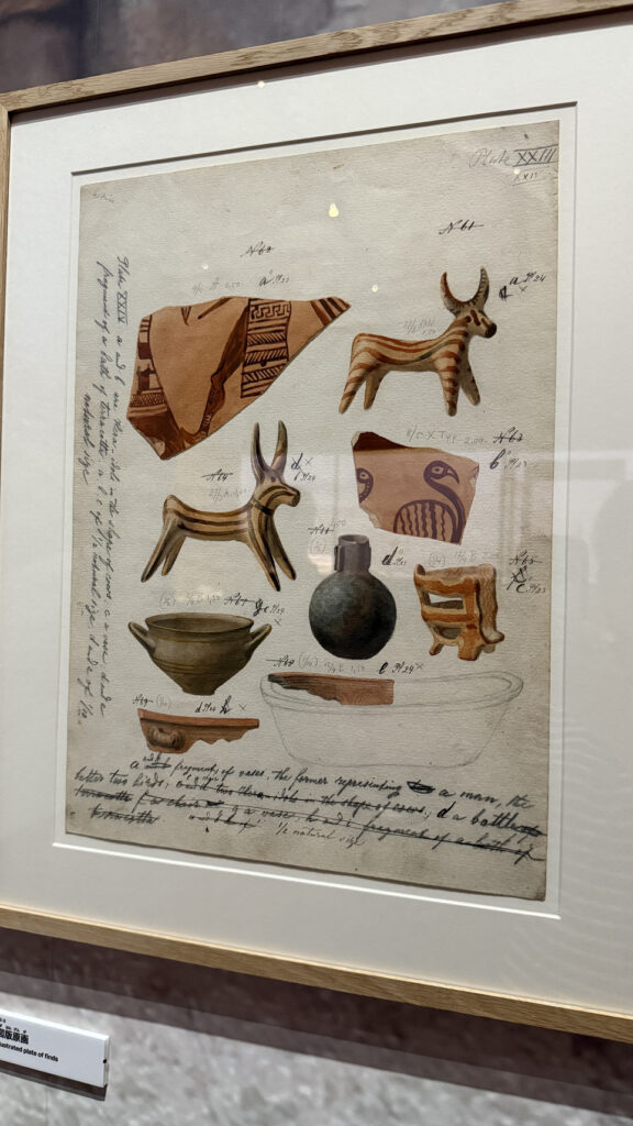 ▲こちらは「ディリンス遺跡調査報告書原画」(19世紀)より。トロイ遺跡を発見したとされるドイツの考古学者・シュリーマンの直筆メモ入り!天理参考館さんは本当にすごいものを所有してるんですよね。