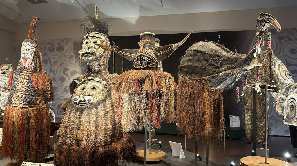 ▲第2章「神々と摩訶不思議な世界」の入口は、パプアニューギニアの祖霊・精霊をあらわした仮面や衣装がずらりと並びます。昭和のドキュメンタリーでよく観たやつ!プリミティブなだけに迫力がありますね。