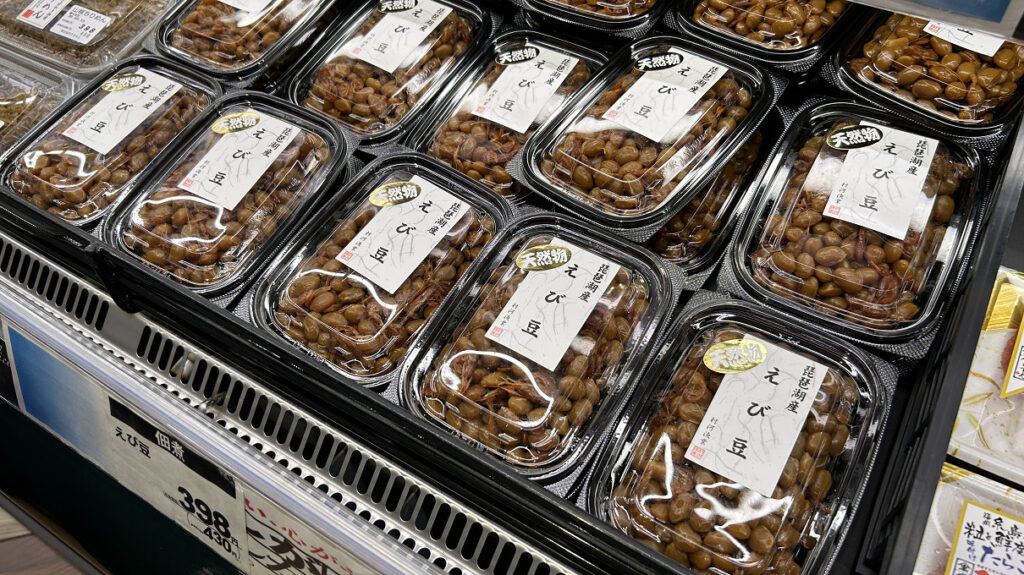 ▲スーパーで見かけた「えび豆」。これも近江名物だそうです。琵琶湖産の小さなエビと豆を醤油で炊いたもの。他ではなかなか見かけない組み合わせですが、買ってホテルで食べたら美味しかった!