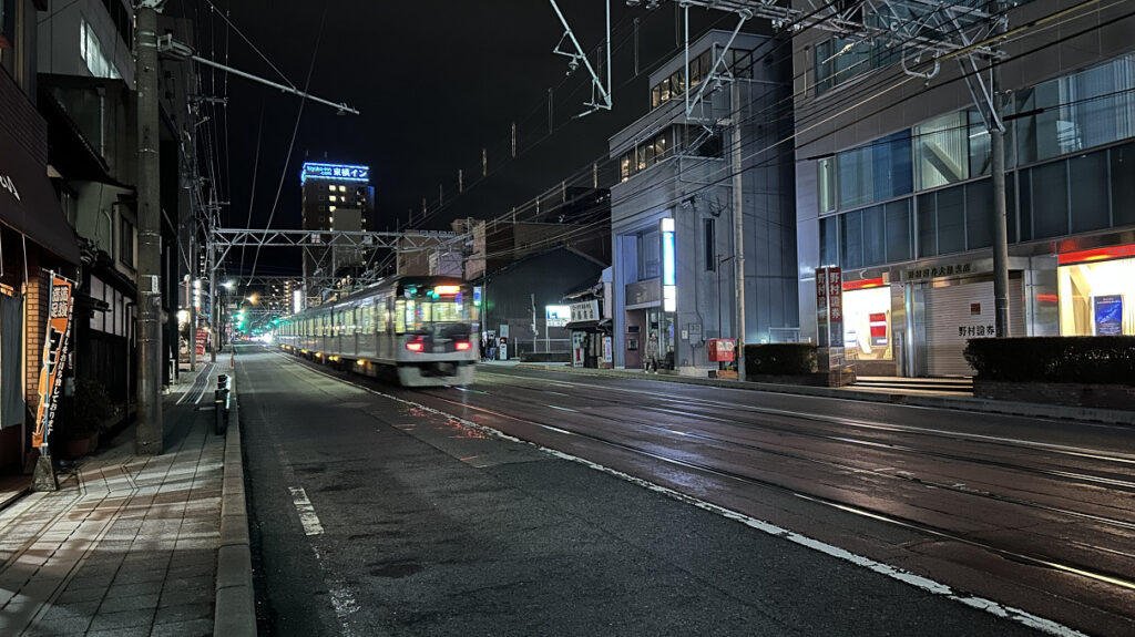 ▲いい感じに酔った帰り道。知らない街をふらふらと歩くのが楽しいです。大津市も路面電車が走っています。私たちはとくに鉄道好きではありませんが、「路面電車が走っている街=好きな街」という認識です。古くて素敵な建物も多くて、歩いていて楽しかったです。