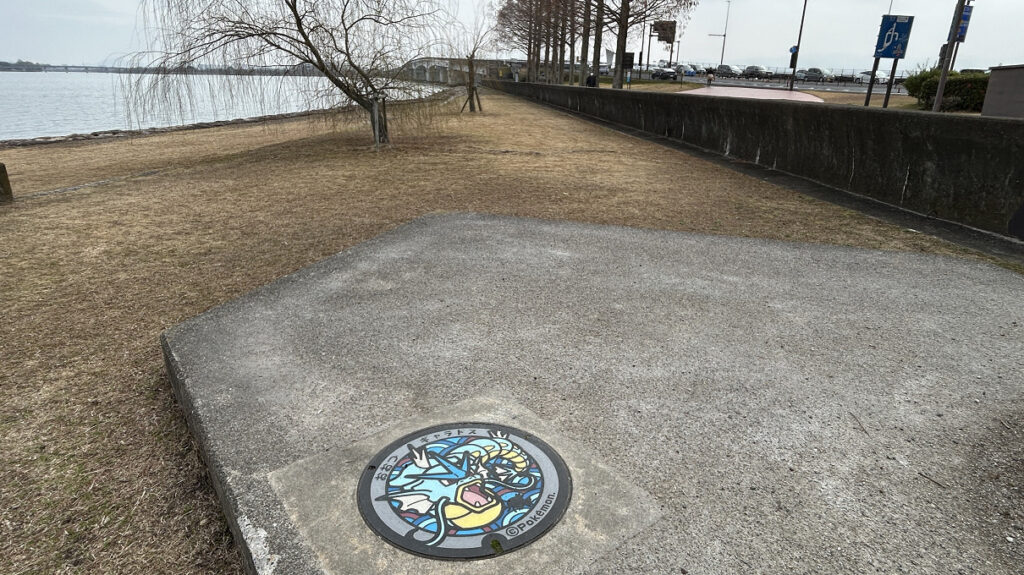 ▲私たちのお目当てはこちらの「ポケふた」(ポケモンマンホール)です。全国に設置されているんですが、アプリ「ポケモンGO」の中でスタンプラリーみたいな機能が登場したので、旅行のついでに集めています。琵琶湖らしくギャラドス×2色のデザインですね。