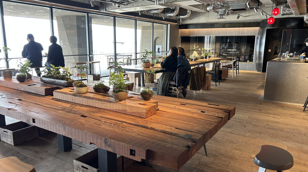 ▲琵琶湖畔をお散歩していると、奥さんから「有名な和菓子屋さんがやってるカフェがあるから行きたい」というリクエストが。行ってみたらこんな不思議な外観!地元で人気の老舗和菓子店「たねや」さんが2025年3月にオープンさせた『LAGO 大津』という店舗なのだとか。